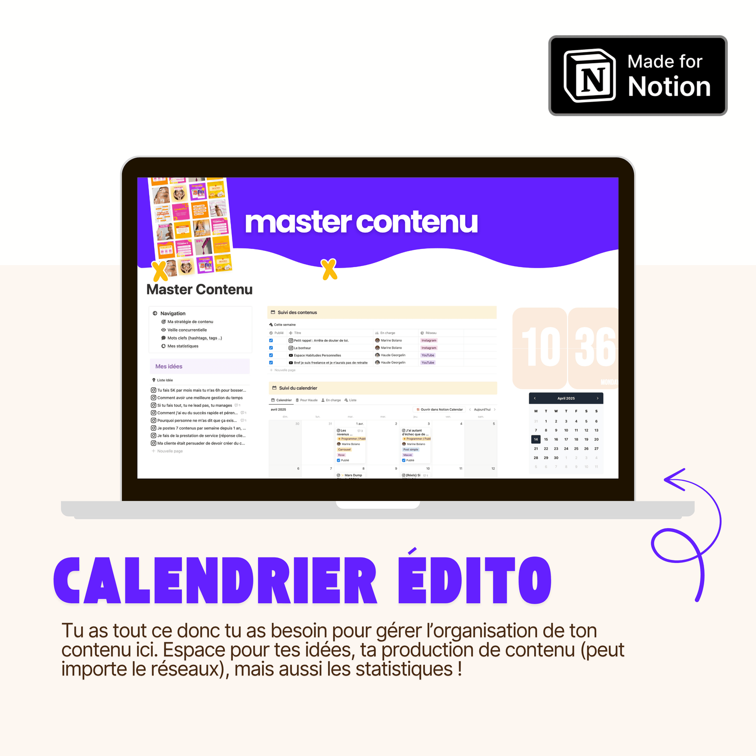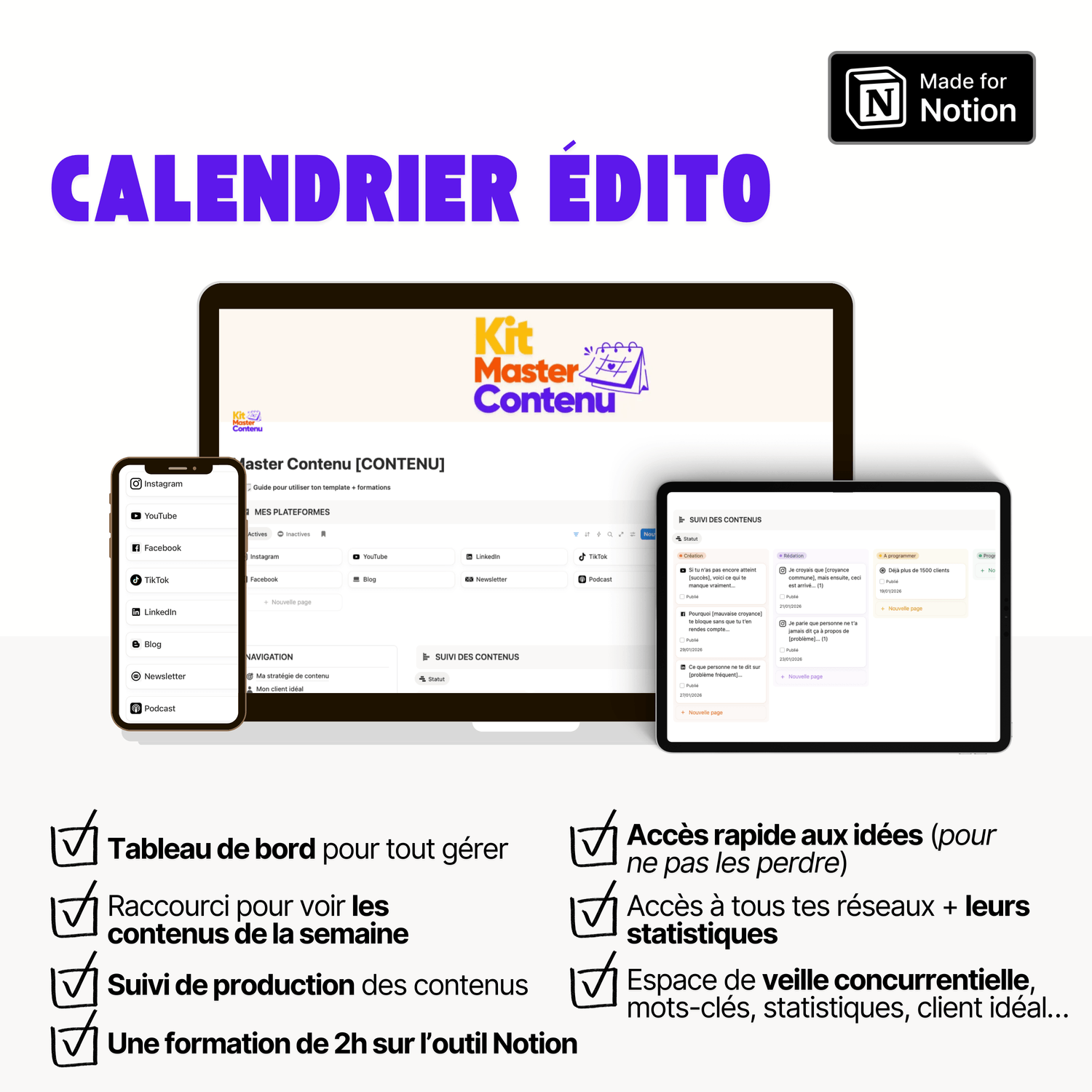 ✅ Un template Calendrier de contenu pour centraliser et planifier facilement tes idées.