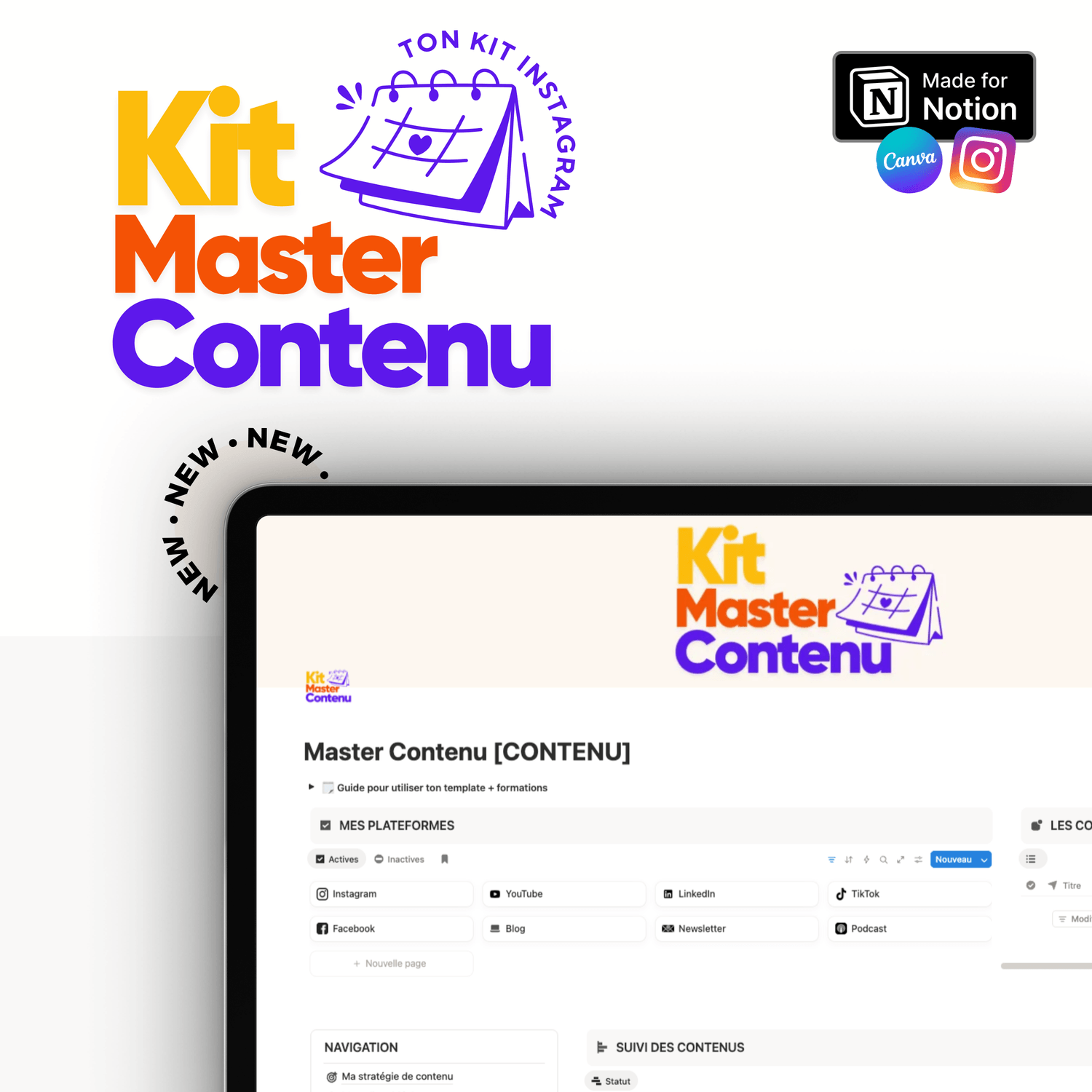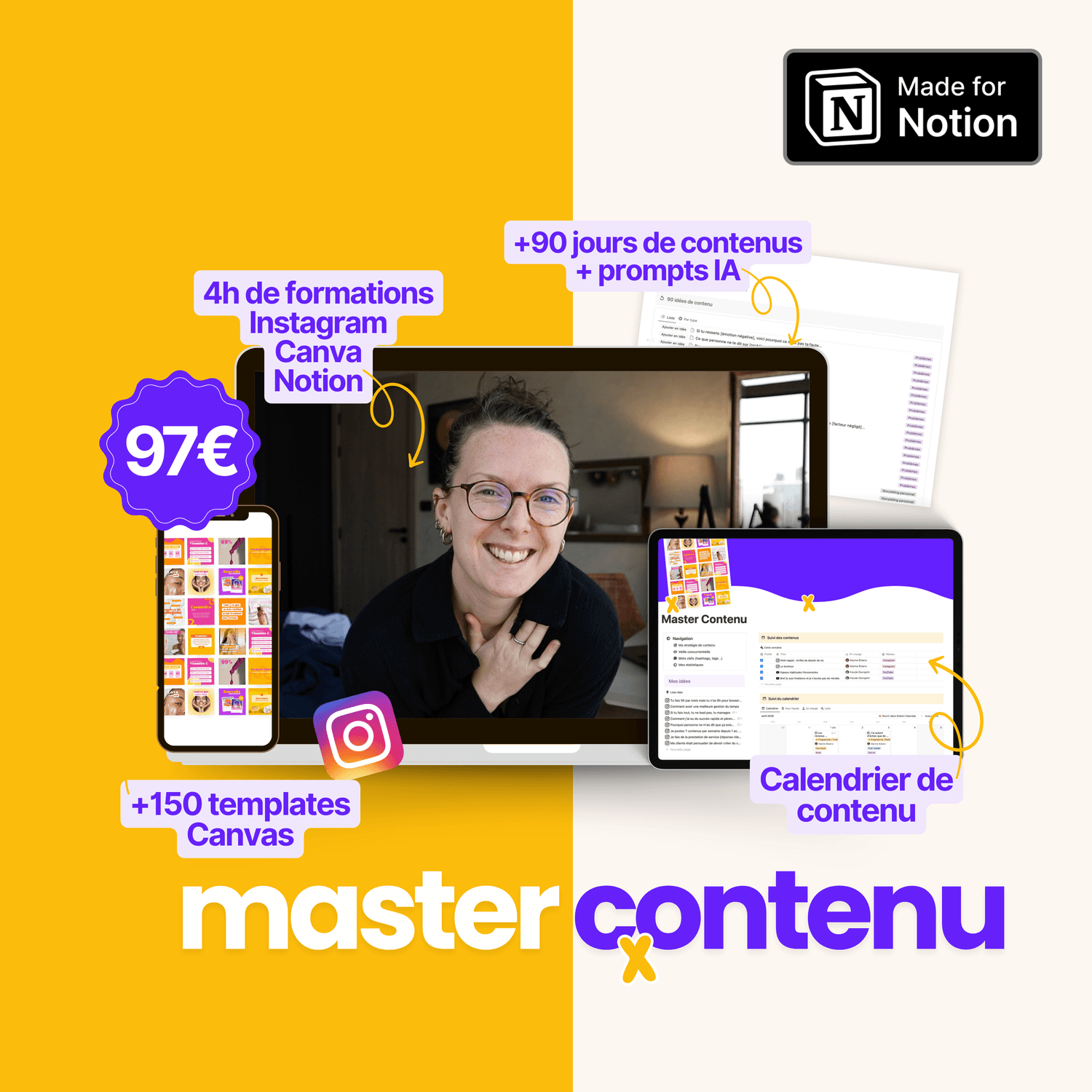 Calendrier éditorial, +90 jours d’idées de posts, +150 templates visuels, prompts IA… Tout est centralisé pour que tu puisses créer et planifier ton contenu sans perdre de temps.