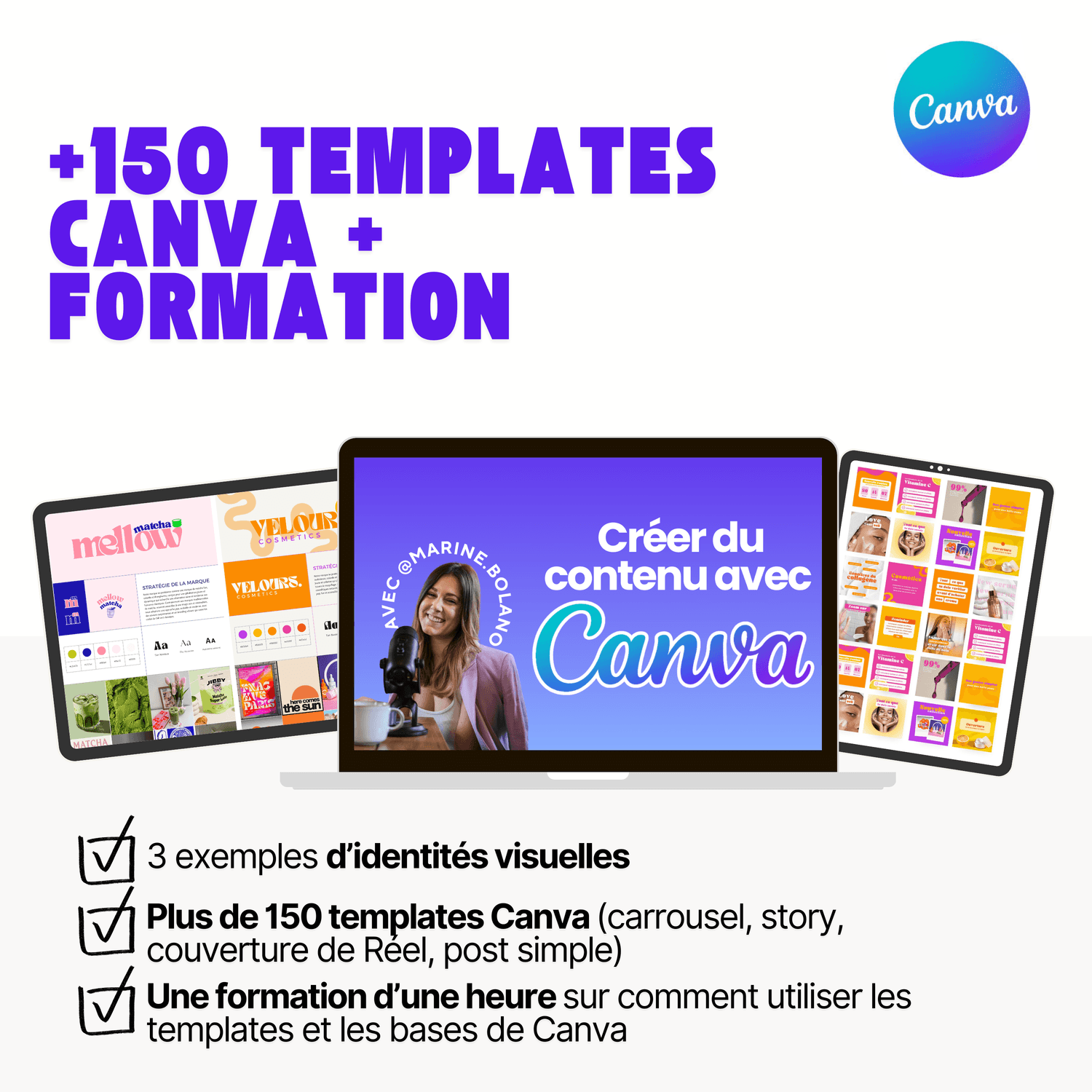 ✅ Plus de 150 templates de visuels pour gagner du temps et harmoniser ton feed Instagram, LinkedIn ou Facebook.